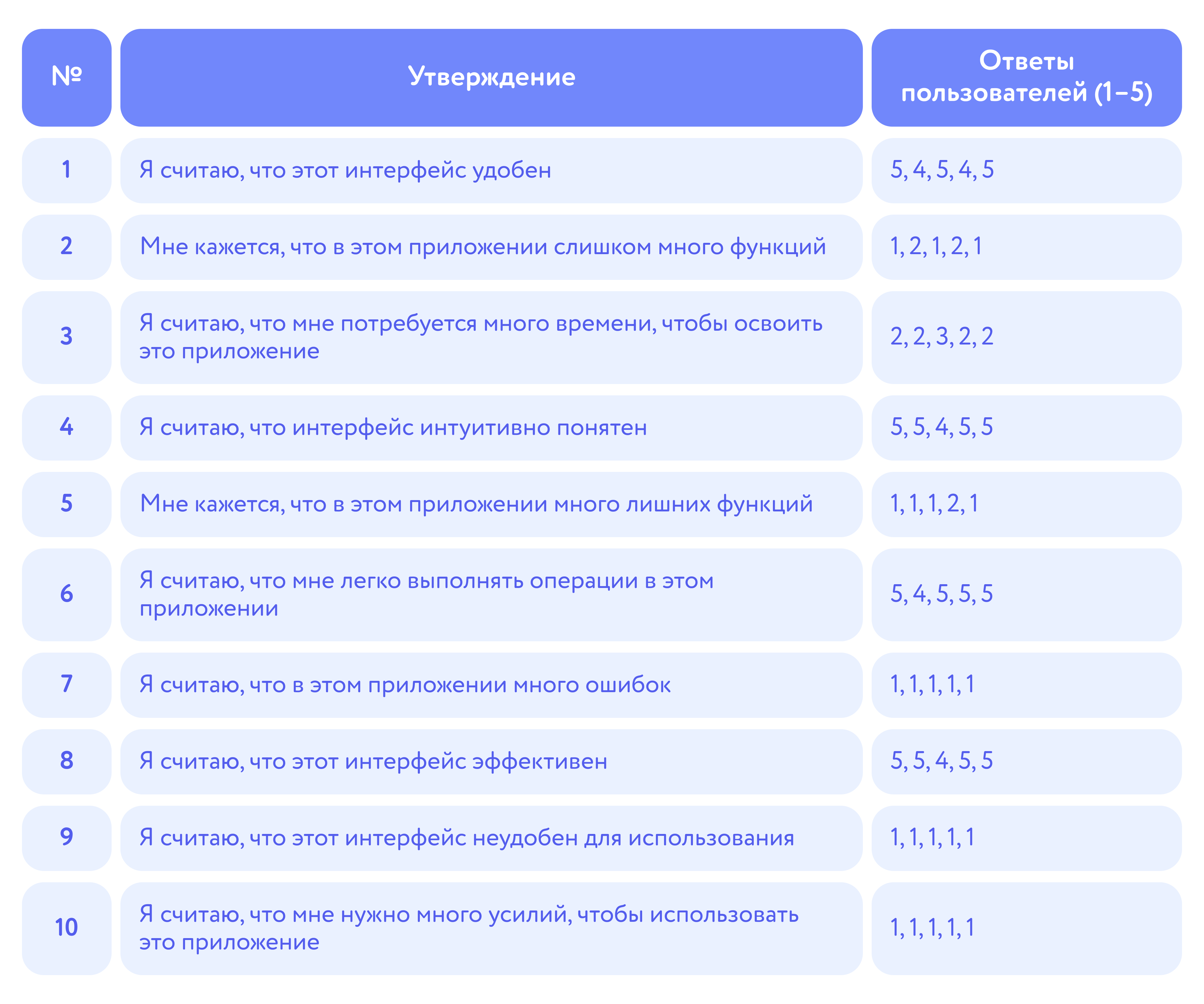 Предположим, что нужно рассчитать SUS для приложения банка. Результаты опроса 5 пользователей для примера такие: