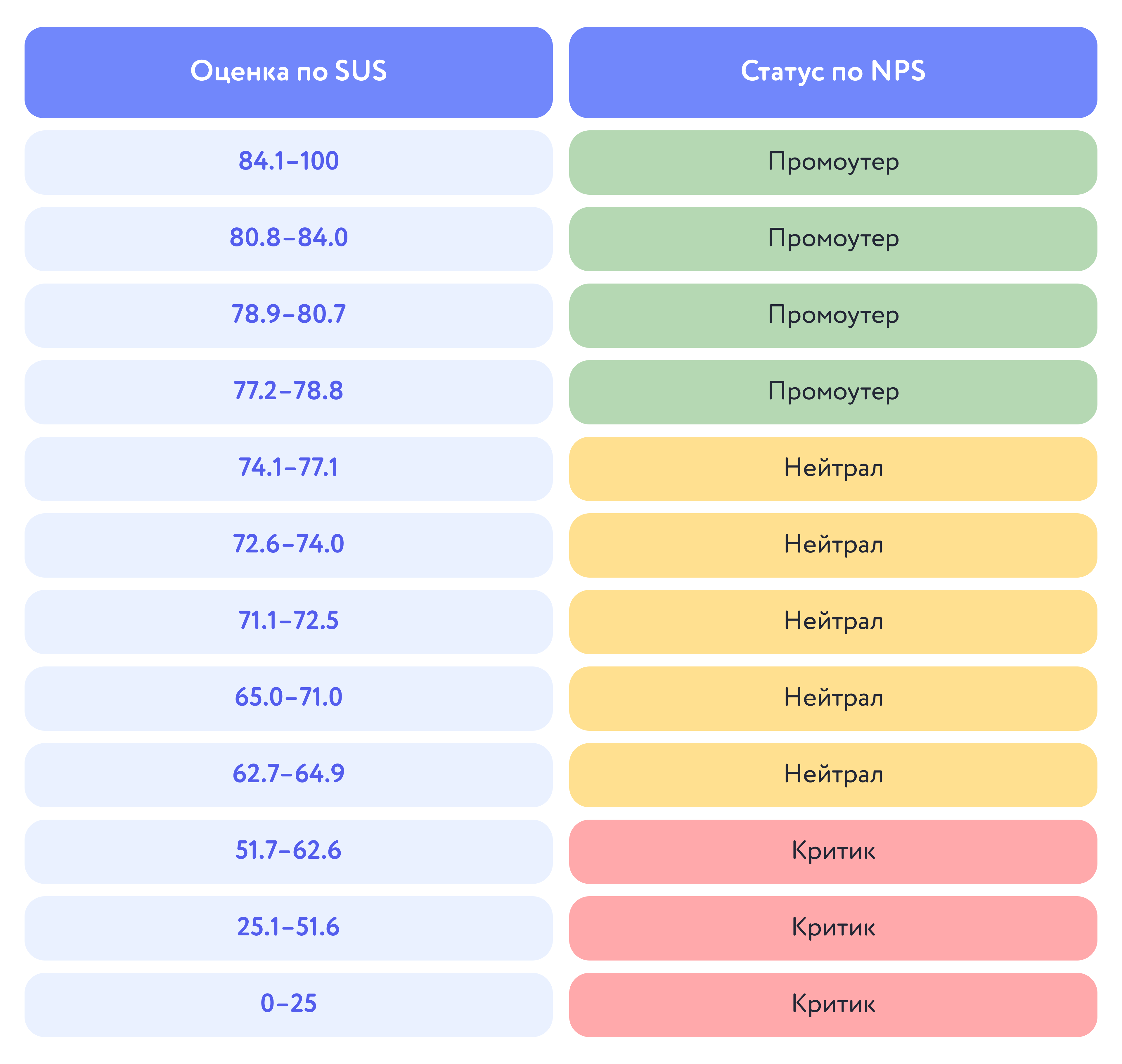 По данными MeasuringU, оценка SUS отлично коррелирует с бенчмарками NPS:
