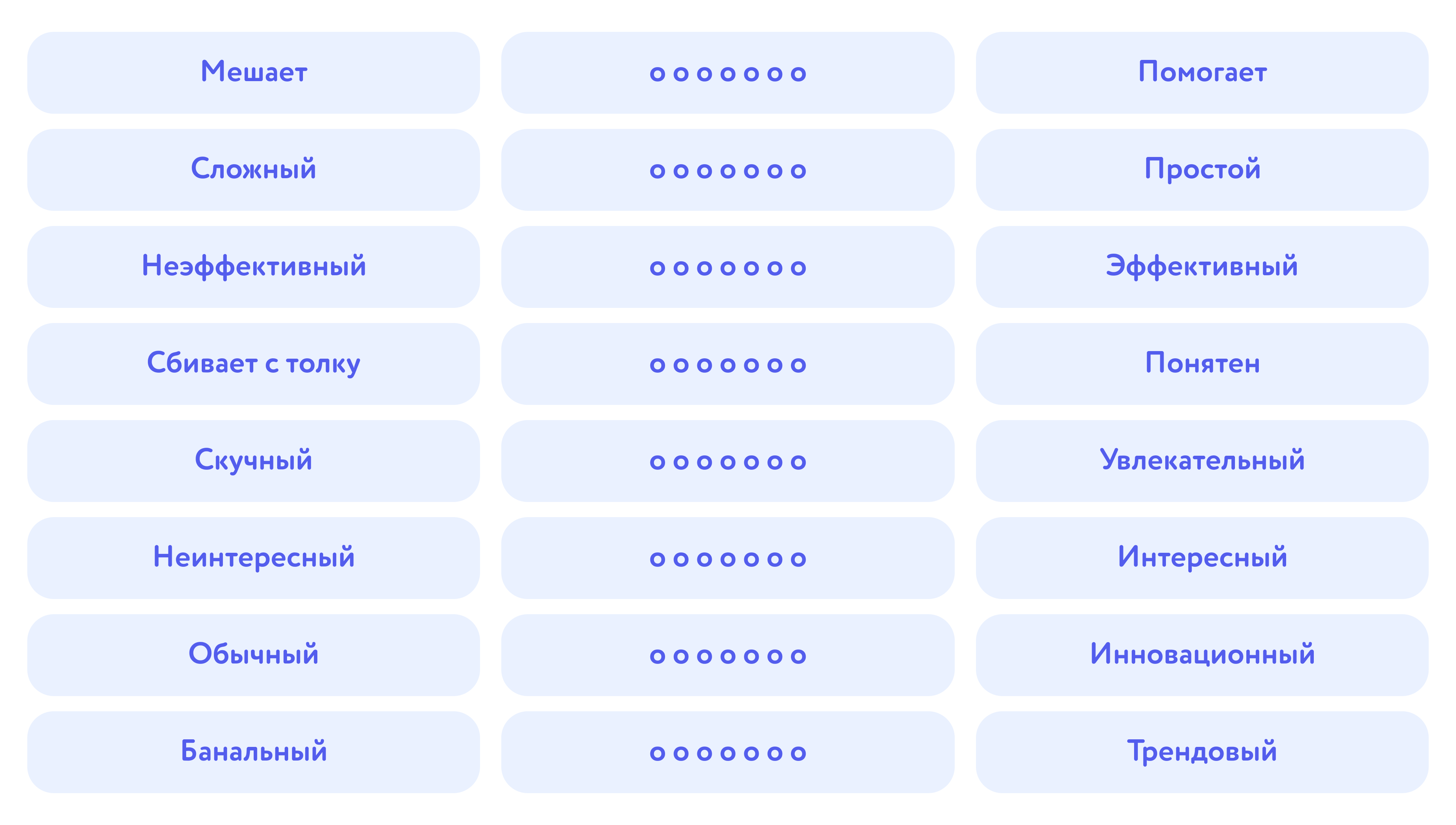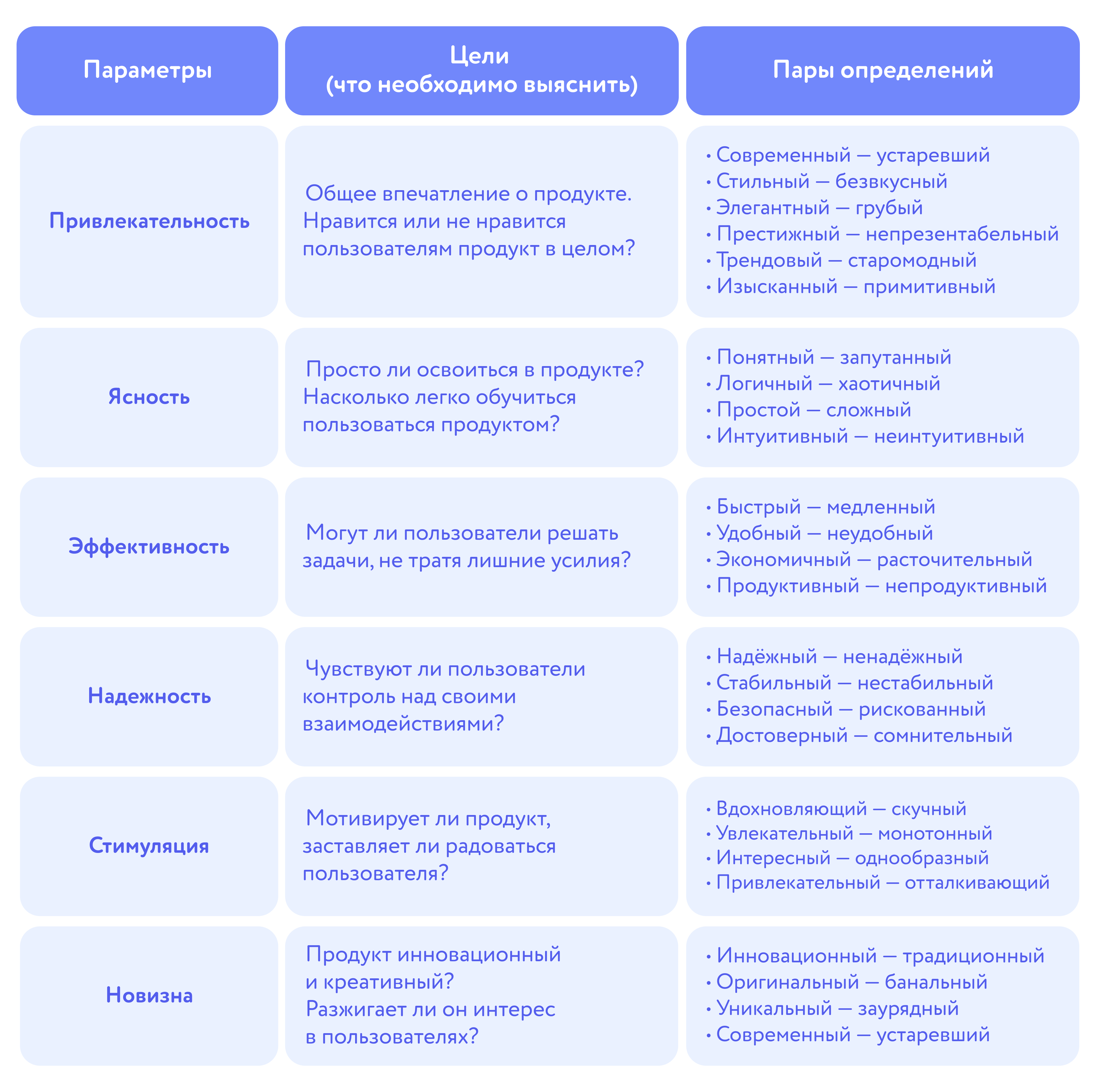 Вероятно, вы обратили внимание, что некоторые пары утверждений тоже очень схожи с полной версией UEQ. Всё так — создатели разделили классический вариант на гедонические и прагматические качества и выделили отдельный блок со шкалой привлекательности, который не вошёл в сокращённый UEQ-S. Затем сравнили и сопоставили средние значения пунктов UEQ-S и UEQ: