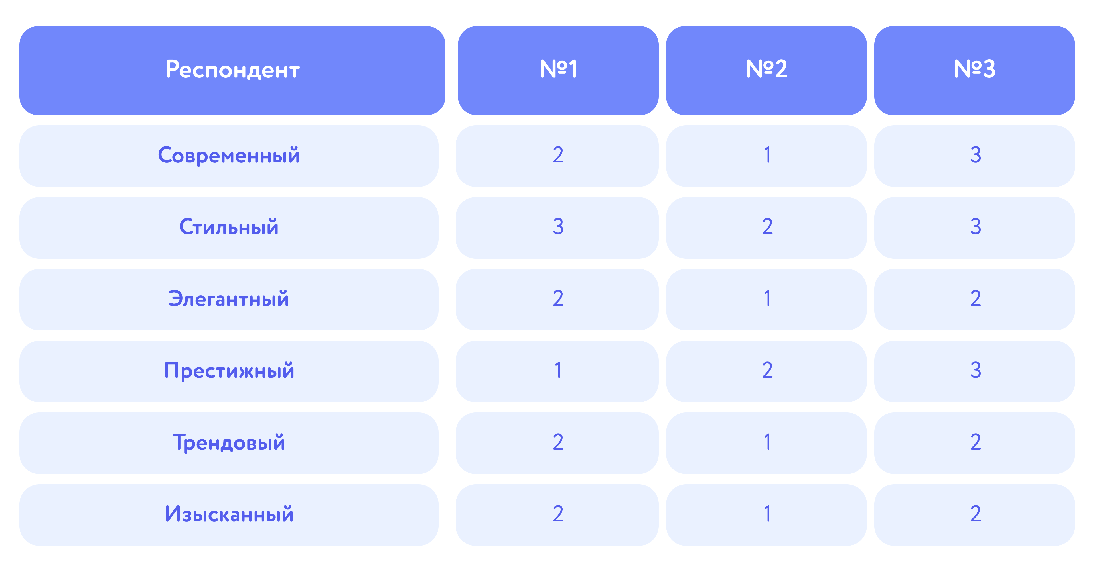 Предположим, что в опросе UEQ-S участвовали 3 респондента и дали такие оценки по 8 утверждениям: