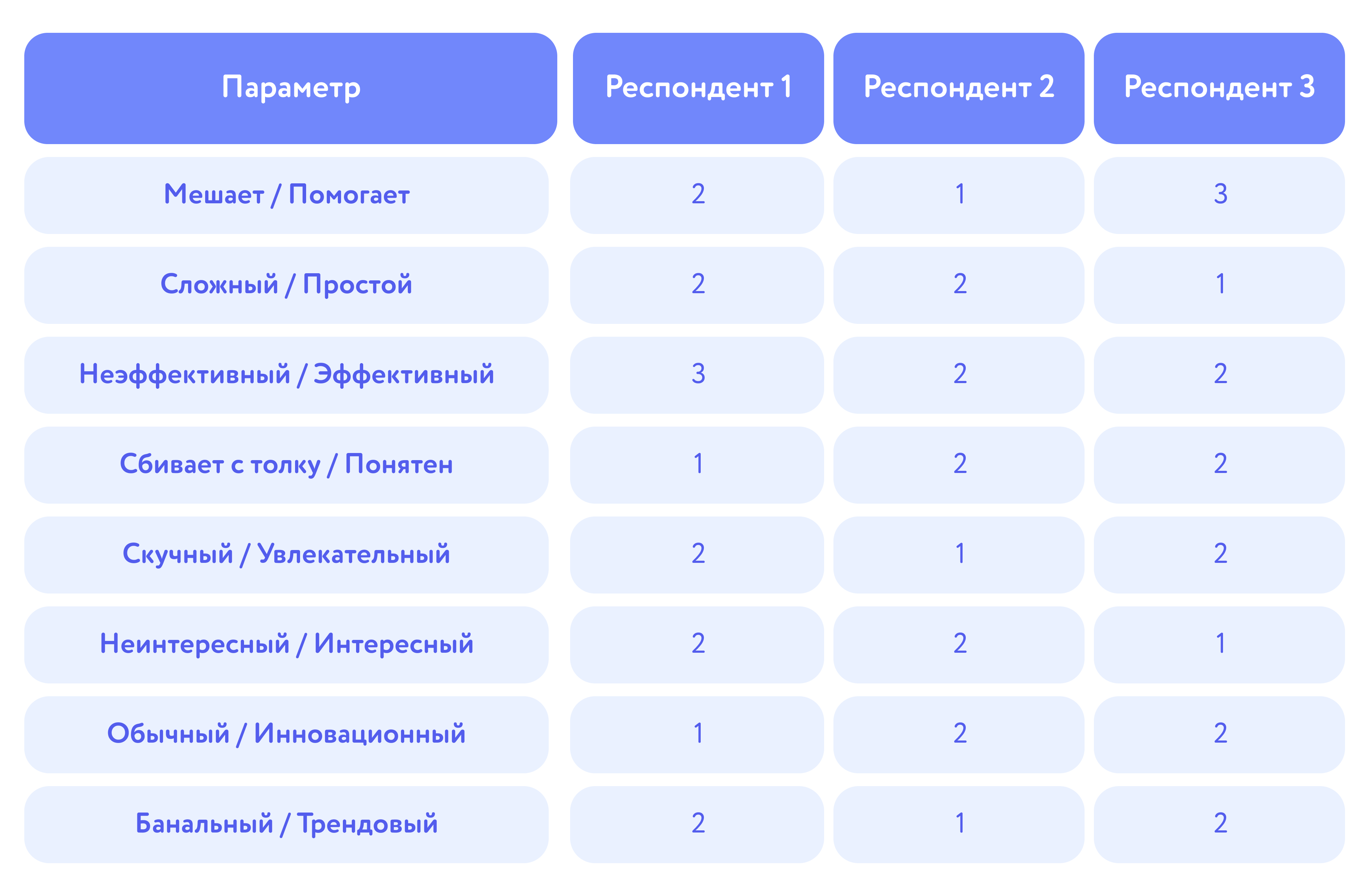 Предположим, что в опросе участвовали три респондента. Для примера рассмотрим оценку категории Привлекательность (в ней 6 пар утверждений). Аналогичным образом рассчитываются показатели по остальным категориям: ясность, эффективность, надёжность, стимуляция и новизна.