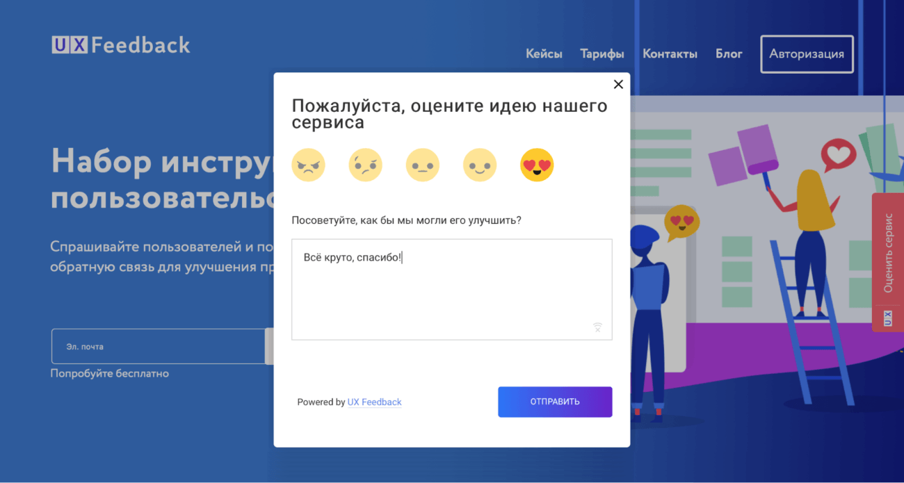Если виджет собирает пассивный фидбек (который пользователи оставляют сами), то появляющаяся форма — активный. Это значит, что с её помощью можно самому инициировать начало диалога с клиентом.